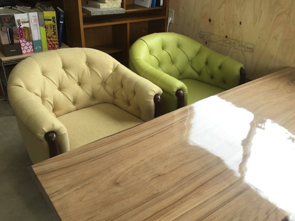 レザー(緑)と布(黄)に張替えました。 生地選びはなかなか難しいので、ご参考にしていただけるようにレザーと布に分けてみました。 作業中の写真をご紹介します。 張...